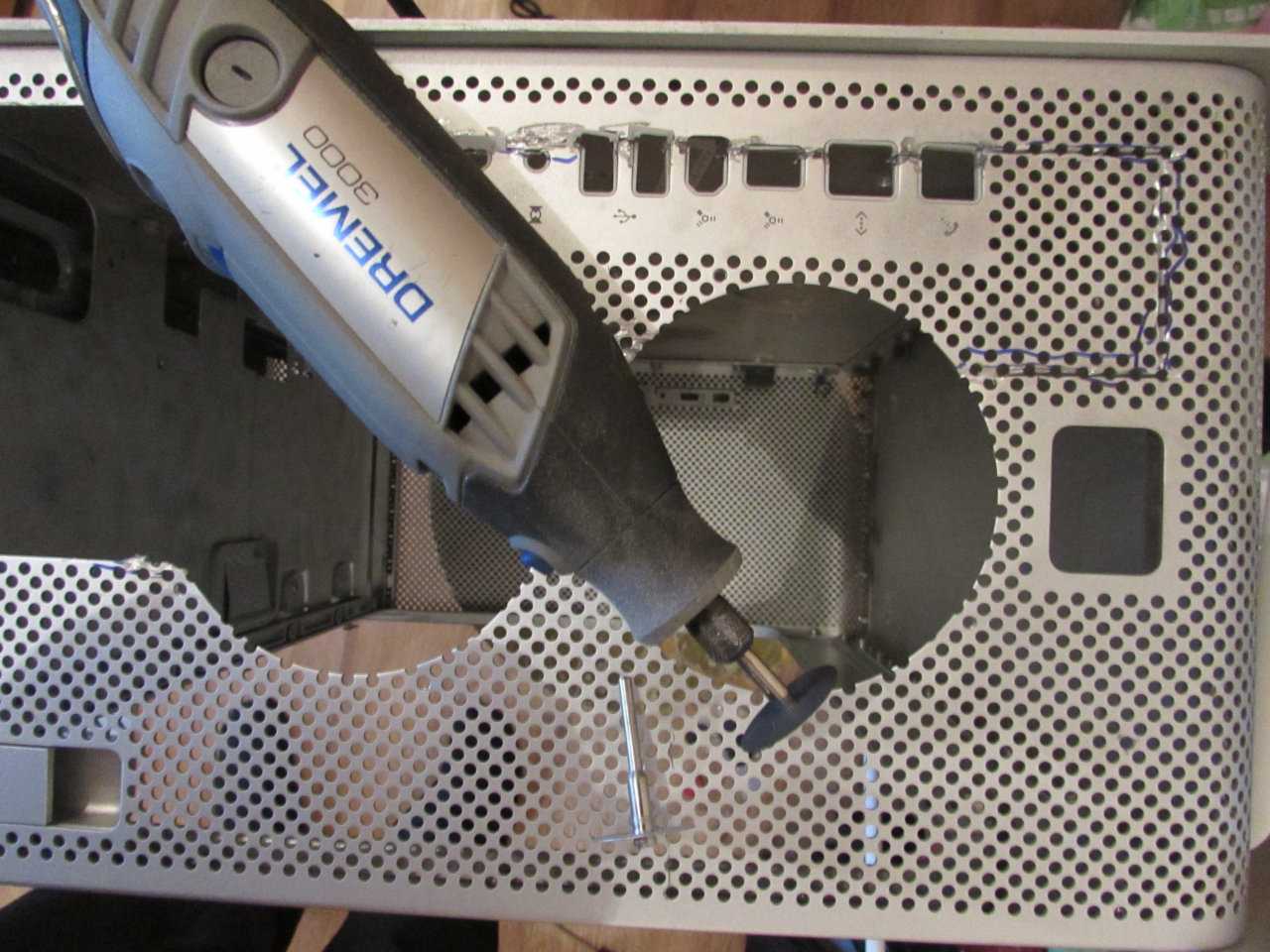 Мне от корпуса был нужен только поддон, к которому крепится плата, и задняя стенка с отверстием под планку материнки и пазами для плат расширения — этот кусок я благополучно выпилил дремелем. Примерив поддон в корпусе G5, я разметил на задней стенке соответствующие отверстия, после чего тем же дремелем варварски удалил все лишнее. После установки новой платы я закрыл оставшиеся отверстия вырезанной из алюминиевого листа пластиной, которую закрепил на заклепках, а к стыкам приклеил декоративный алюминиевый же уголок из строительного магазина.