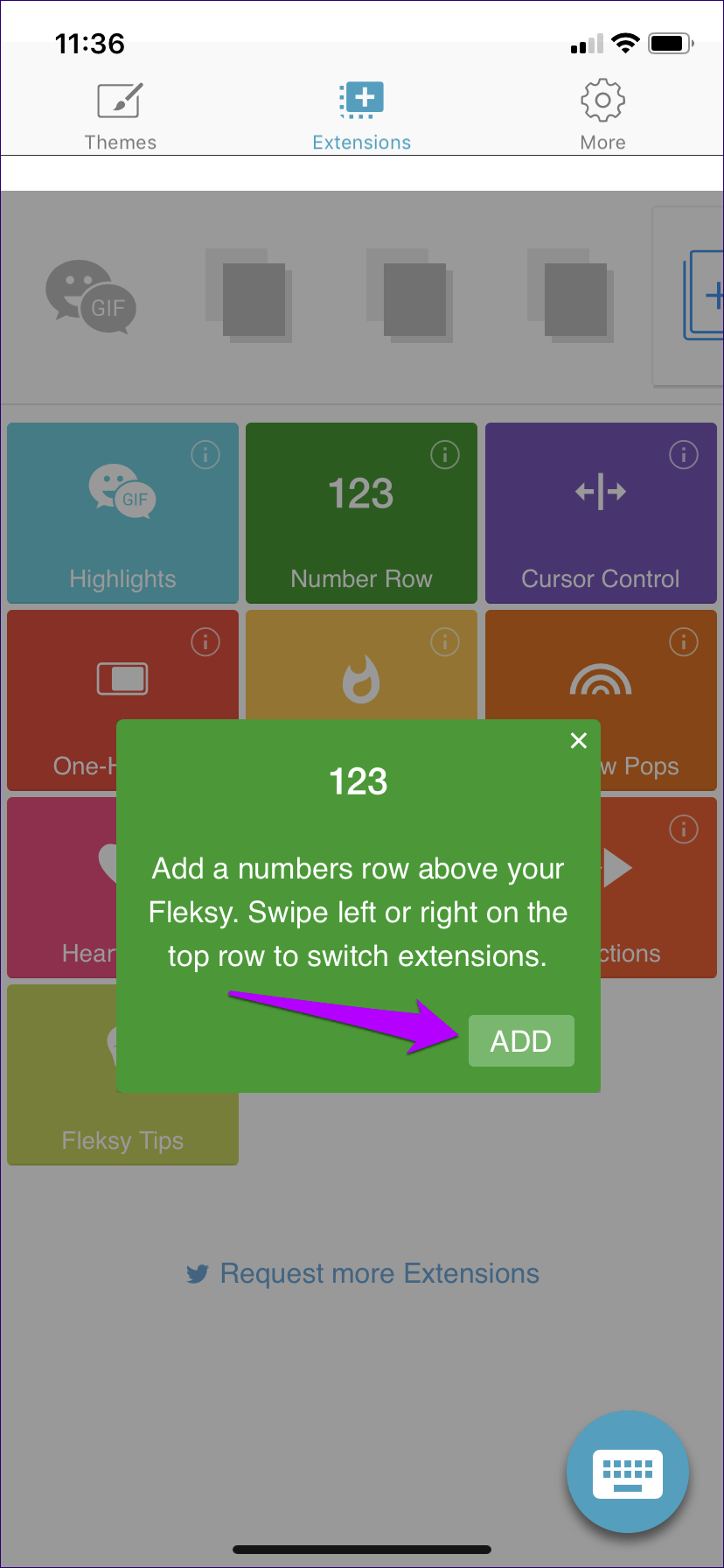 Клавиатура также имеет выделенную строку номеров, но вам нужно включить ее, что достигается с помощью того, что Fleksy называет «расширениями». Откройте приложение, нажмите «Расширения», а затем нажмите «Строка номера». Легко как то.