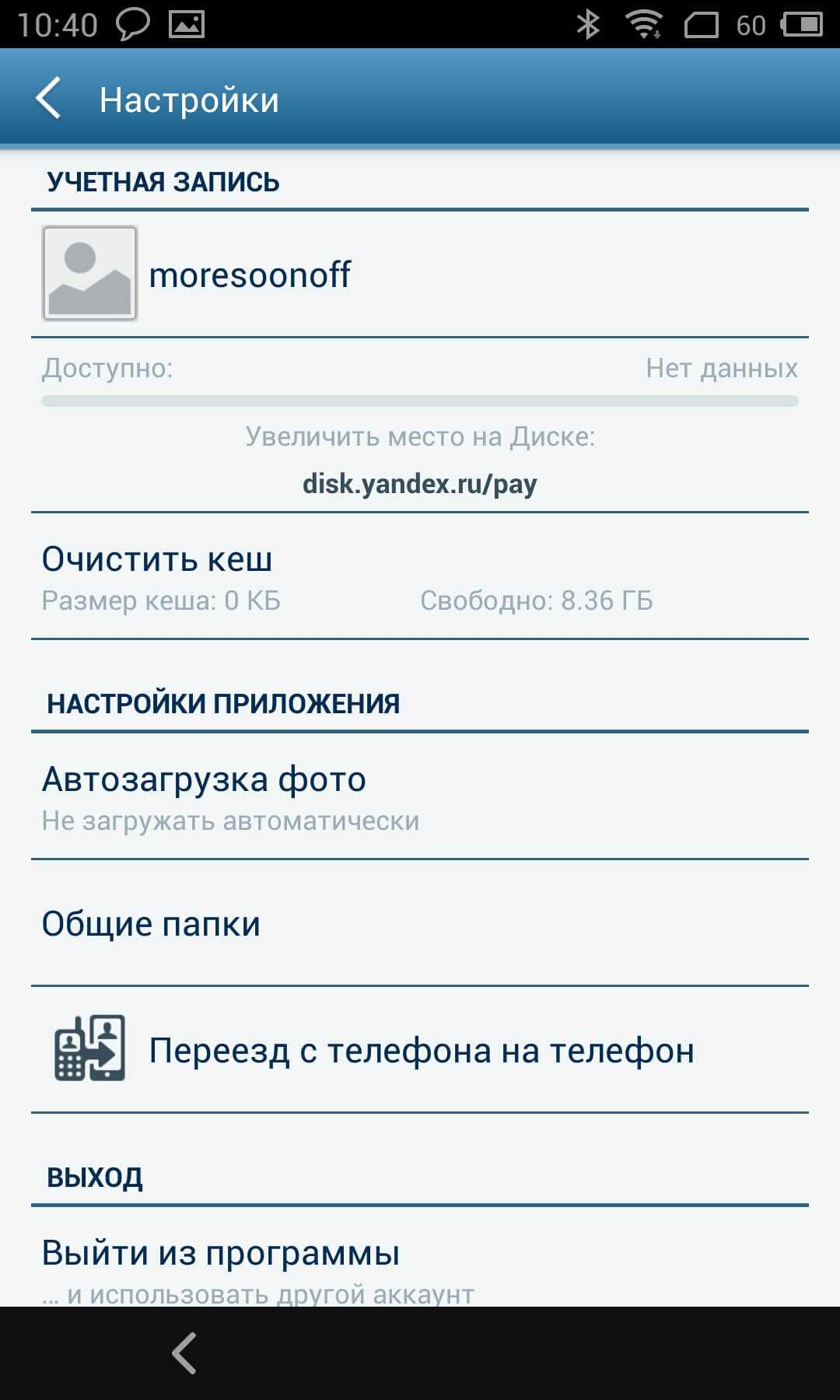 После этого нужно установить приложение «Яндекс.Диск» на ваше устройство на базе Android. Далее следует запустить «Яндекс.Диск» и авторизоваться в приложении с тем же логином, который был указан в «Яндекс.Переезд». После этого откройте меню приложения и выберите пункт Настройки.