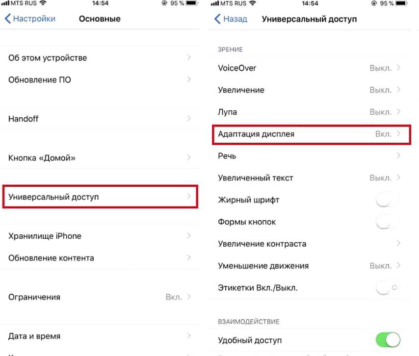 - В блоке «Зрение» необходимо перейти в «Адаптация дисплея».