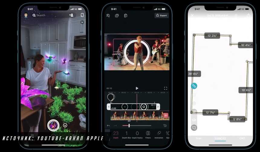 В-четвертых, разработчики Snapchat и videoLib уже анонсировали поддержку лидар. У вас появится возможность без хромакея накладывать трехмерные модели виртуальной реальности.