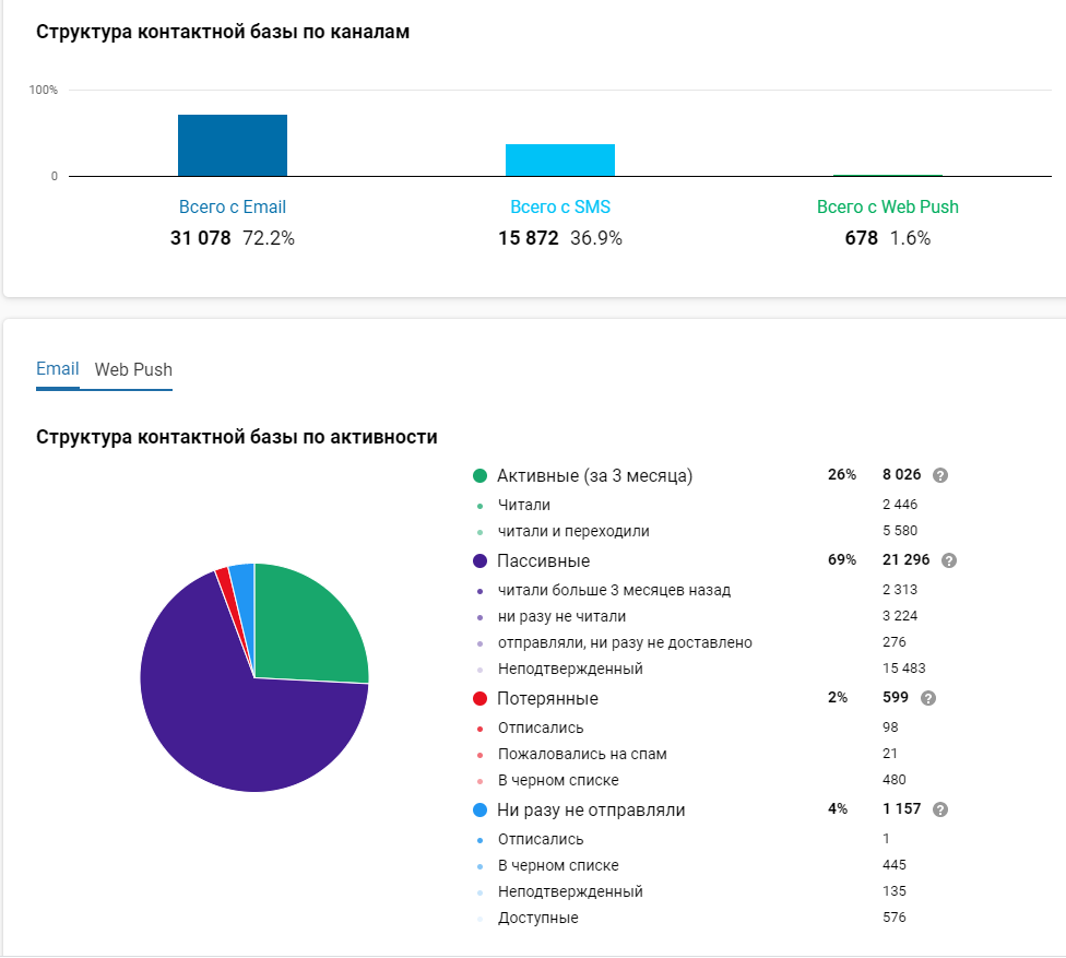 Динамика роста контактной базы, изменения ее активности и другие важные показатели легко отслеживаются на аналитическом дашборде системы.