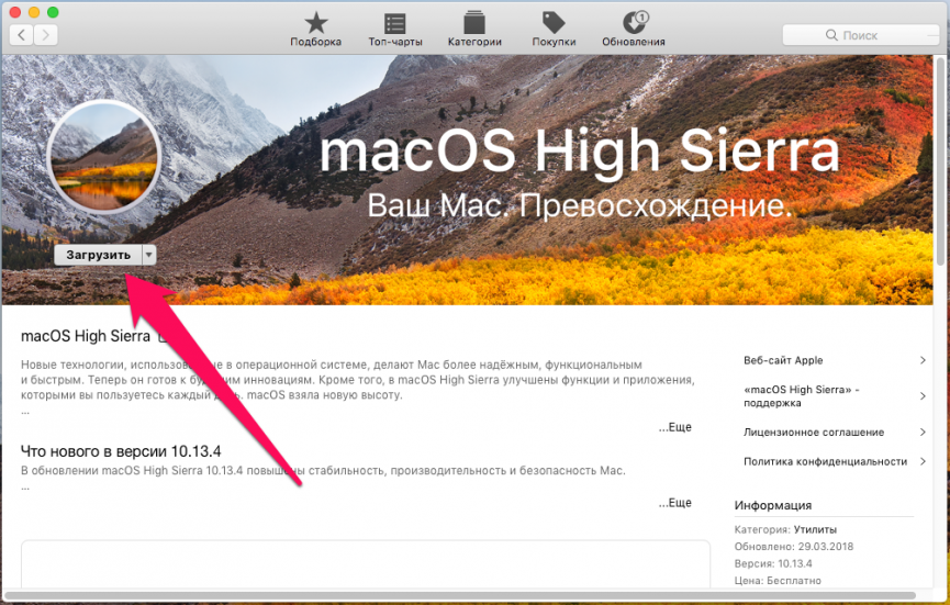 Нажмите кнопку «Загрузить» на странице macOS High Sierra, чтобы потом установить ее на ваш Mac. Размер файла превышает 5 Гб, поэтому скачивание займет некоторое время. Когда файл полностью загрузится на ваш Mac, он автоматически запустит инсталлятор. Следуйте его указаниям, чтобы установить новую версию.