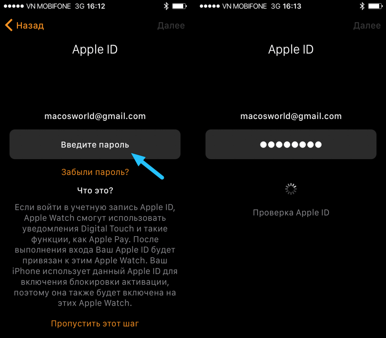 Вам необходимо ввести данные от учетной записи, которая используется в часах. Если это другой Apple ID, то сначала необходимо снять блокировку, иначе вы не сможете синхронизировать часы с другим устройством. А для этого, как правило, необходимо указать правильный пароль от предыдущего ID.