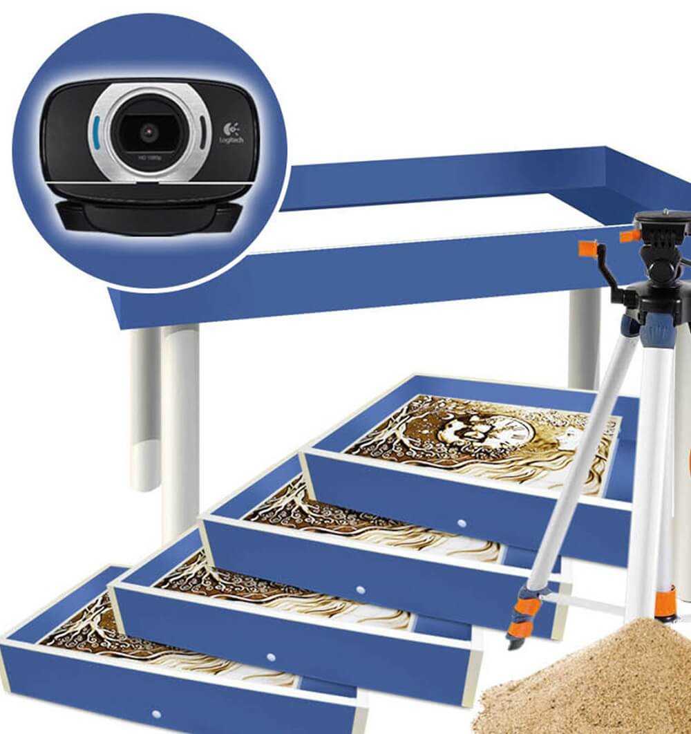 Стол (планшет) с поверхностью из стекла (можно органического) с бортиками и подсветкой снизу. Бортики нужны, чтобы песок не сыпался на пол. Подсветка сделает создаваемые из песка картины ярче и рельефнее. Как это здорово на видео.