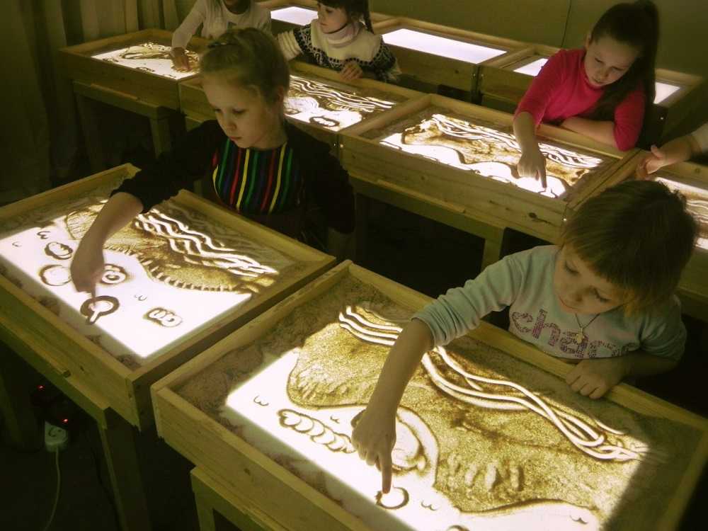 Для занятий по рисованию песком оптимальной будет группа в 5-6 человек. Поэтому для оборудования одного класса понадобится шесть столов с ящиками для песка и стол педагога.