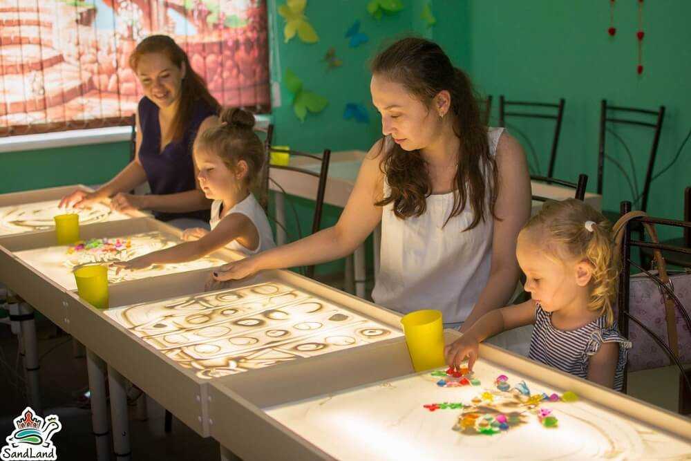 - Класс, где проходят занятия. Он должен быть подготовлен к урокам: световые столы с ящиками для песка, удобные стулья, шкафы, где хранятся материалы и инструменты. Покрытие поверхностей в классе выбирайте таким, чтобы его было легко убирать.