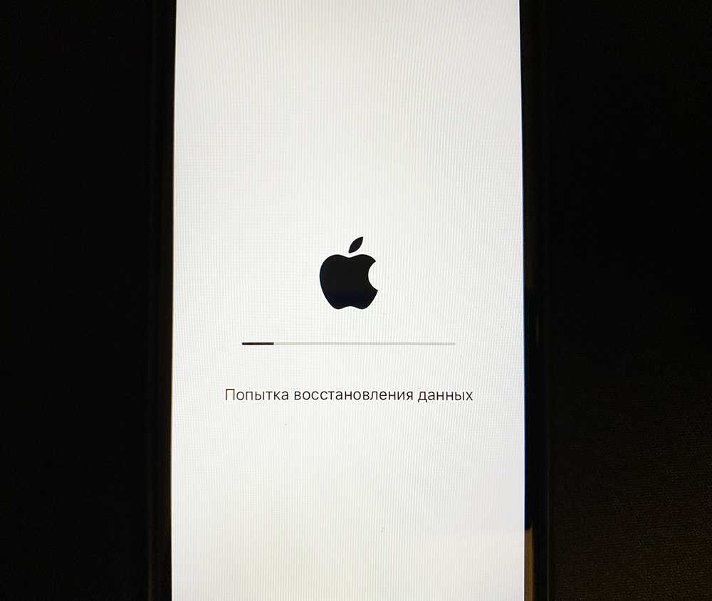 Затем айфон перезагрузился, показал ещё одну полоску загрузки на белом фоне, уже без текста. Причём загрузка теперь будто намертво зависла на первой четверти и держалась так минут 10.