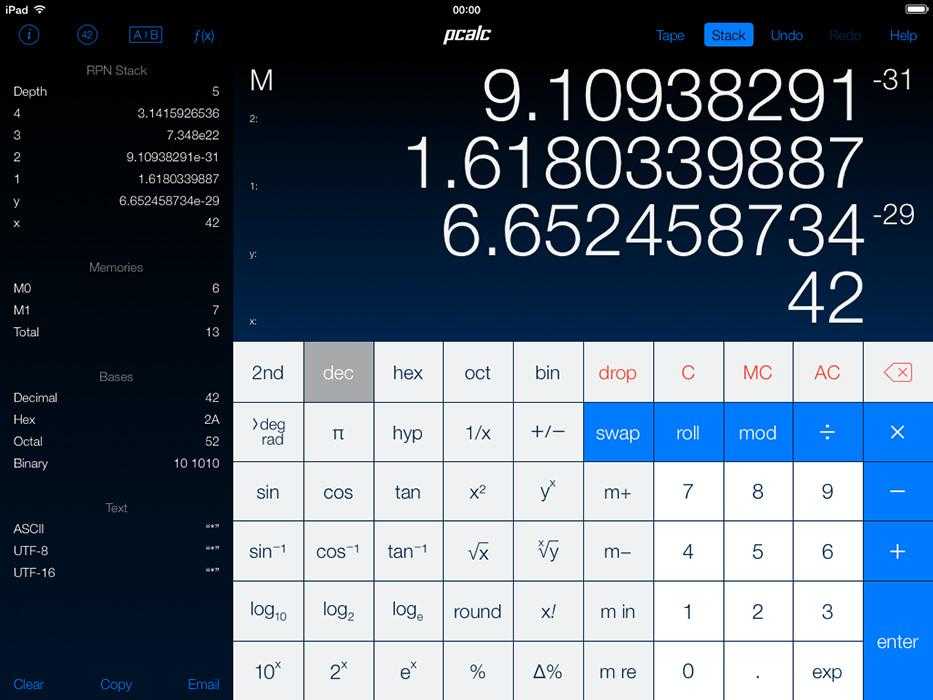 PCalc Lite для iOS заслужил место в этом списке как бесплатный, чрезвычайно гибкий научный калькулятор, оснащённый мощными функциями, которые можно увеличить с помощью многочисленных надстроек. Базовый пакет даёт вам возможность работать с тригонометрическими и логарифмическими функциями, открывает режим радиан, отмену и повтор действия, а также конвертер единиц и постоянных. Максимально расширить функционал утилиты можно за 9,99 долларов США.
