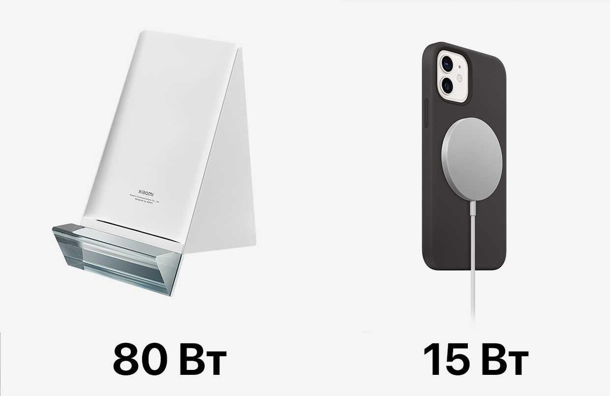Станция от Xiaomi слева заряжает смартфон за 45 минут. Блинчик Apple справа делает это за 3 часа.