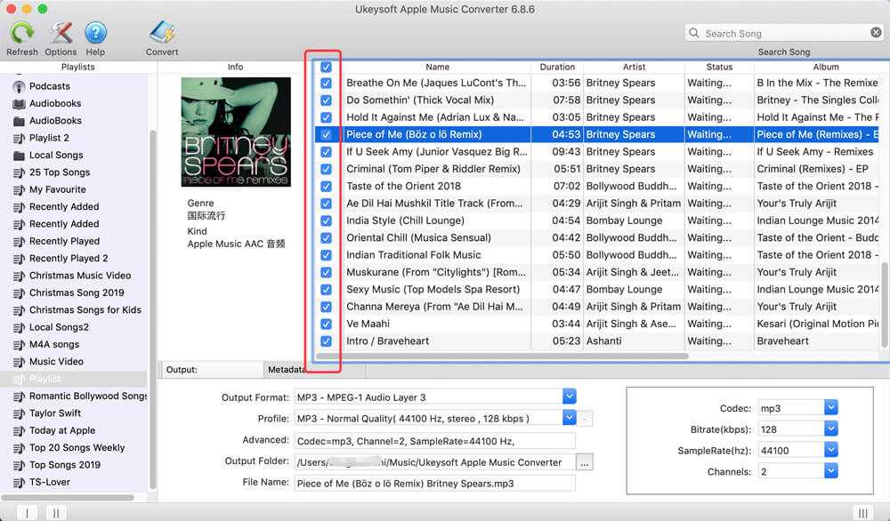 Нажмите «Плейлист» в левом столбце, и все песни будут показаны в главном интерфейсе. Затем выберите нужные песни, которые вы хотите загрузить, установив флажок напротив песен.